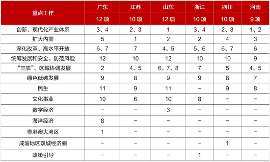 ■ 重点举措解读:六省共同关注的工作重点:在科技创新方面,各地将从加强基础研究、推动科创与产业融合、强化企业创新主体地位、打造创新联合体、建设重大创新平台、推动科技成果转化应用、打造创新生态、机制保障等维度着力。在现代化产业体系建设方面,产业链与产业集群建设、传统产业和新兴产业及未来产业并举、数字经济、现代服务业等内容值得关注。在扩大内需方面,紧扣中央要求,提出要“激发有潜能的消费”,“扩大有效益的投资”,形成“消费和投资相互促进的良性循环”。在对外开放方面,与上年相比,突出稳外贸、引外资,扩大制度型开放。六省的特色举措:广东大湾区建设迈向纵深,围绕“一点两地”新定位,布局再上新台阶。江苏强调高能级平台体系打造,从创新平台、开发平台、产业平台三方面,发挥平台的支撑作用。山东尤其重视数字经济,推动数字产业化、产业数字化和基础设施建设,以数字变革新赛道引领形成经济发展新动能。浙江注重有效市场与有为政府有机结合,围绕民营经济特点,提出要积极发挥政府引领作用,支持产业集群式发展。四川政府工作报告中能级提升与风险防范并重,将短长结合防范化解地方债务风险。河南特色在于农业强省建设,农业发展措施贯穿于科技创新、粮食生产到食品产业等全链条。