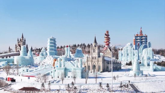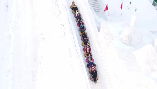 以长春的冰雪新天地为例。这座世界级冰雪主题乐园占地156万平方米,从2019年冬季开园起,每年围绕一个主题进行原创设计与制造。2023-2024年冬季的主题是“冰雪丝路,龙腾盛世”,冰雪总用量超过80万立方米,园内打造了130多组冰雪建筑和30多项游乐项目。最火爆的是1260米长的“空中雪漂流”,排队最长的时候要3个小时。我们是2月23日晚上去的,和其他游客自由组队,一共8人,每人坐一个雪圈,前人抓着后人的双脚,紧密相连,在一分半钟时间里一鼓作气,体验了一把速度与激情交织的雪漂流。