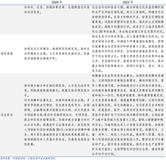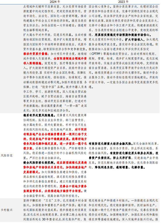 第六,对于防风险与债务化解。地方债务化解方面,我们认为今年“一揽子化债方案进一步落实”,融资端(特殊再融资债或还有1万亿空间)、项目端(12省项目投资受限制)均有涉及。地产领域风险化解方面,与2023年相比,不再提“防止无序扩张”,重点是“一视同仁”满足房企合理融资需求。我们认为这是中央“两个毫不动摇”政策的重要体现,也是提振市场信心的重要发力点。