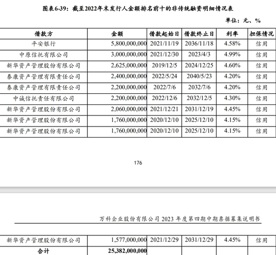 万科2023年第四期中期票据募集说明书显示,截至2022年底,在其前十笔的非传统融资项目中,借款方有两家保险机构:新华资产和泰康资产,金额合计分别为46亿元和97.82亿元。