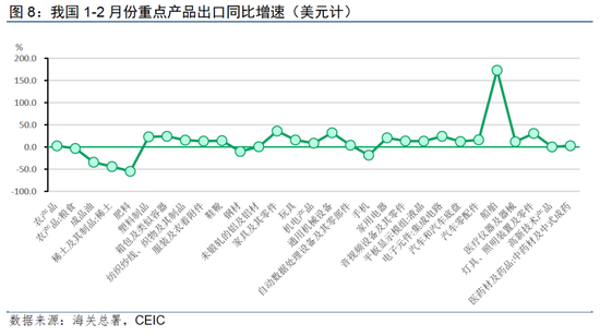 主要机电产品出口全线上涨。其中,1-2月船舶出口金额领涨173.1%,出口量增长59.9%;汽车出口增速有所下滑,出口金额增长12.6%,出口量增长22.1%;耐用消费品中,家用电器、音视频设备及其零件、液晶平板显示模组、灯具照明装置及其零件出口金额分别增长20.8%、13.4%、13.2%、30.5%。手机出口下降18.2%,降幅有所扩大,但出口量增长12.8%,表明出口下滑主要受到价格下跌影响。