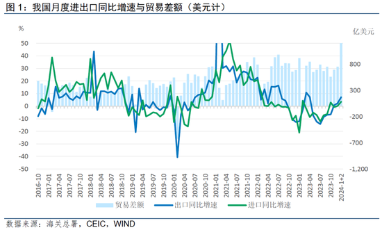 2024年1-2月我国进出口开局超预期。按美元计价,1-2月份我国进出口总值9308亿美元,为有数据公布以来的最高值;出口5280.1亿美元,同比上升7.1%;进口4028.5亿美元,同比上升3.5%。从原因看,外需复苏对出口形成有力支撑,强内需、低价格共同推动进口回升。