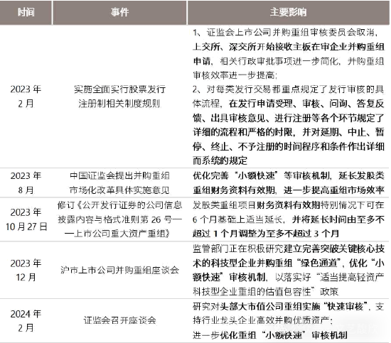 以上政策着重在3个方面提升并购重组的审核效率:(1)简化行政审批事项,并制订详细的审核流程和严格的审核时限,提升市场对于并购重组的审核预期;(2)延长财务资料有效期,减少因财务过期延长审核周期;(3)研究并优化并购重组“绿色通道”,优化“小额快速”审核机制。