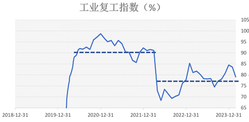 2022年以来,疫情反复严重影响了工业经济复工情况,企业正常的生产秩序受到巨大的负面冲击,带来严重的疤痕效应。工业复工指数自2022年4月出现了断崖式下降;虽然疫情过后工业复工指数出现趋势性回升,但仍处于低位,即便与疫情期间的2021年相比也仍有较大差距。