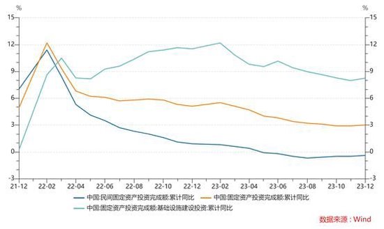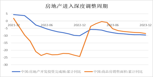 房地产方面,2022年以来,在房价上涨预期不再、房企现金流恶化导致部分楼盘停工、项目难以交付等的影响下,居民购房信心持续走弱,房地产市场需求疲弱加剧、进入深度调整阶段,2022年4月至今房地产开发投资增速持续为负。
