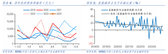 直接融资中债强于股,1-2月包括企业债券和非金融企业境内股票在内的直接融资新增7128亿元,同比多增293亿元,其中债券融资6592亿元,股票融资268亿元,分别同比多增1292亿元/少增999亿元,并且股票融资自2023年7月至今已经连续8个月同比少增。直接融资占社融的比重也仍未改变下降趋势。2024年1月12日证监会召开新闻发布会提到“当前IPO节奏明显放缓”,下一步将“科学合理保持IPO常态化;继续做好逆周期调节,做好一二级市场协调发展”。