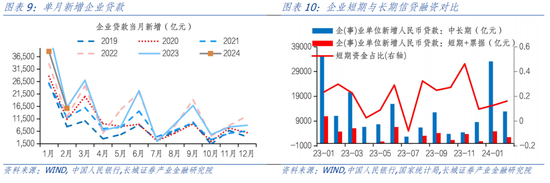 2024年1-2月新增人民币贷款6.37万亿元,同比少增3400亿元,居民和企业贷款分别新增3894和54300亿元,分别同比少增759亿元和8600亿元,无论是居民端还是企业端,短期融资需求都仍有收缩倾向,而企业中长期融资需求韧性相对较强。