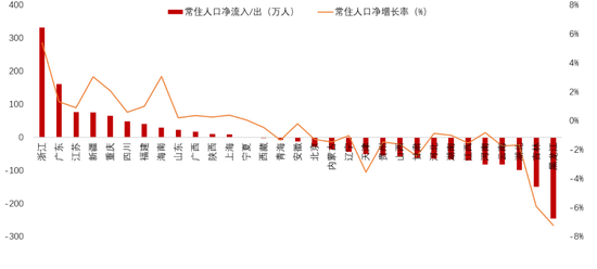 分化可以体现在GDP创造的区域分布上,如美国创造GDP50%,就是那些星星点点的地方。中国也是一样的,未来创造GDP的最多的地方就在长三角,珠三角的地位可能会略有下降,长三角的地位还是会继续上升,整个人口流向是从北往南流,这是一个大趋势。2023年作为人口小省的浙江人口净流量(剔除自然增长人口后)仍然超过人口大省广东,这应该是连续第四年了。就是因为浙江服务业的比重高于广东。