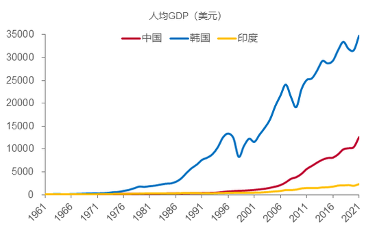 人均GDP的增长是一场马拉松比赛,像日本、韩国50年代就开始跑了,我们到1977年后才开始跑,已经落后那么多了,所以要拼尽全力去跑,等你拼尽全力之后,发现已筋疲力尽,就跑不动了,为什么呢?人口已经老龄化了。我们当前的经济特征除了各种优势之后,劣势就是未富先老,未富先债。这是我们的问题所在。日本虽然现在失去30年,GDP还是全球第三,说明前面的基数高,后面发展慢了也不要紧,但如果前面基数低,为了赶超拼命地追的话,动作要变形的。过去60年中国、韩国、印度的人均GDP走势图