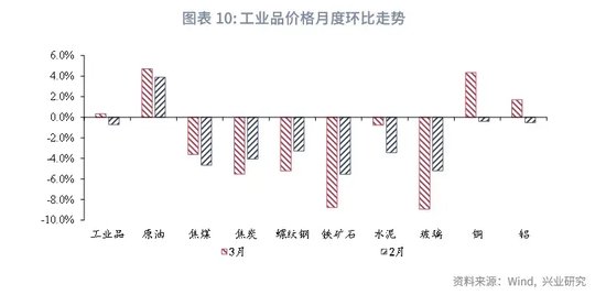 工业品方面,3月工业品价格整体平稳但品种间分化较大。原油价格3月份环比4.7%, OPEC+持续减产,俄罗斯的炼油厂遭到袭击,导致产能出现缩减。黑色系中螺纹、铁矿、焦炭环比-5.2%、-8.8%、-5.5%,节后需求预期的进一步调整为主因。有色金属价格出现反弹,铜、铝环比4.4%、1.7%。综合来看,2月PPI同比预计录得-2.8%。