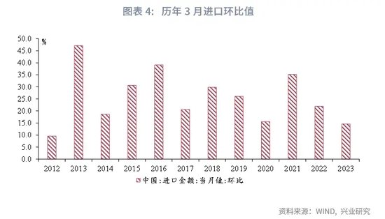在进口方面,原油价格回升叠加低基数影响下,3月进口增速或明显回升。从大宗商品价格看,3月原油价格同比较前月上行5.5个百分点至9.9%,增速为2022年9月以来的最高值,这或从价格层面推高我国进口同比读数;从基数效应看,2023年3月进口环比增长14.6%,为近十年历年同期以来的最低值。