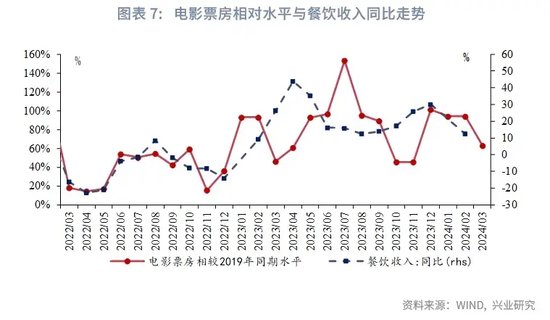 餐饮收入方面,春节假期影响消退,服务消费同比或小幅回落。3月,19城日均地铁客运量同比增长7.8%,环比增长28.8%。电影票房方面,3月日均票房约相当于2019年同期的64%,低于1-2月均值水平94%,高于2023年3月的46%。