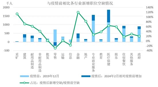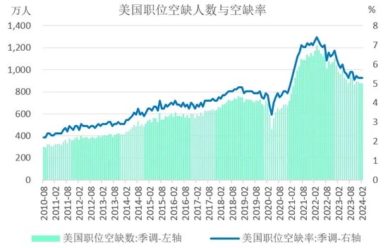 一是劳动力市场的供给恢复缺口不足。导致这方面的因素很多,比如新冠疫情导致的劳动力永久损失,移民暂时性流入下降,后遗症问题导致缺勤率升高,居家办公习惯后不愿返岗,兼职和灵活就业增加和全职就业下降等等。由于劳动力恢复不及时,美国劳动参与率尽管一度恢复,但随后趋于停滞并仍低于疫情前,而平均每周工作时长也不断回落。同时美国的职位空缺数尽管一度回落,但依旧保持在875万个,远高于疫情前的600万个。从行业看,相较于疫情前,专业商业服务、医疗保健、住宿餐饮、政府部门的职位空缺数仍然很高。