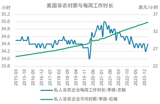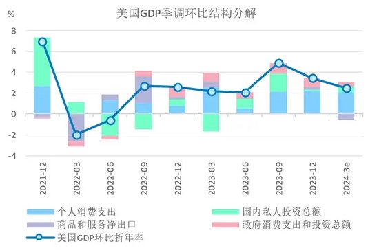 数据显示,2023年三、四季度美国GDP环比折年分别增长4.9%和3.4%,连续大超市场预期,全年增长2.5%,高于潜在增速。亚特兰大联储GDPNow模型则预计2024年一季度美国经济将继续环比折年增长2.5%,考虑到该模型相对准确的过往历史,以及众多高频数据的佐证,一季度美国经济大概率将继续高于潜在增速。