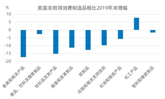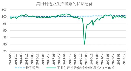 二是产业链回归美国成效不足。通过对中国贸易和产业链时长遏制措施,以及通过《通胀削减方案》《芯片与可续法案》等措施,美国希望将制造业回流美国,促进供给曲线修复,并摆脱对中国的依赖。从效果来看,中国企业借助美国友岸(东南亚等国)和近岸(墨西哥)借道进入美国,使得美国的制造业回流本土计划有所折扣。从美国制造业生产指数走势看,目前美国制造业尚未恢复到长期趋势,而从分产业的数据看,与2019年末相比,耐用消费品制造业有增有降,而非耐用消费品则多数下降。