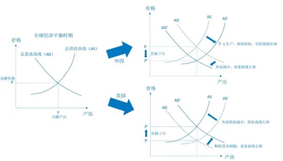 在两国分开的AD-AS图中,中国损失了来自美国的外需,需求曲线AD左移至AD’,而中国则积极保障生产,并新增了产能(部分由于疫情期间的全球新增订单),供给曲线由AS右移至AS’,最终导致均衡价格下行(右上图)。相反,美国损失了来自中国的供给,供给曲线由AS左移至AS’,同时为应对疫情通过财政与货币政策刺激总需求,需求曲线AD右移至AD’,最终导致均衡价格上升(右下图)。
