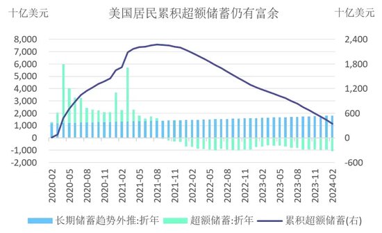 二是超额储蓄的影响似乎被低估了。疫情期间居民部门最多时期积累了超过2.2万亿美元的超额储蓄,经过长达2年半的消耗,目前还剩约3000-5000亿美元的规模,预计能继续维持4-6个月。此前流行的观点认为,由于存在收入分配不公平问题,不需要等到超额储蓄耗尽美国消费就会减弱。但从实际情况来看,超额储蓄对美国消费的支撑作用似乎被低估了。