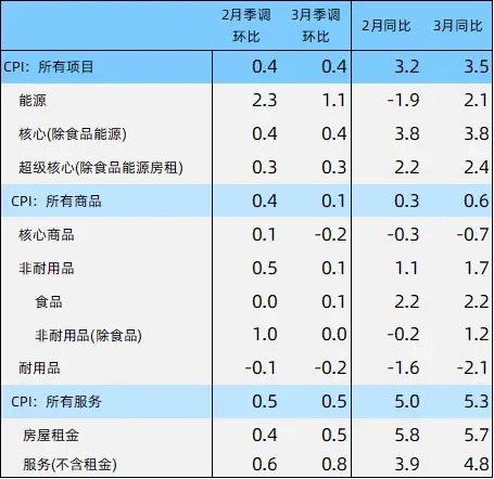 美国劳工统计局刚刚发布的数据显示,美国3月CPI同比增3.5%,高于预期的3.4%,同时也高出前值3.2%。美国3月CPI环比增0.4%,超过预期的0.3%,持平前值。剔除食品和能源后,美国3月核心CPI同比增3.8%,高于预期的3.7%,持平前值。3月核心CPI环比增0.4%,高于预期的0.3%,同样持平前值。