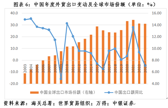 今年政府工作报告在回顾过去一年的工作时指出,多重困难挑战交织叠加,其中世界经济复苏乏力,地缘政治冲突加剧,保护主义、单边主义上升,外部环境对我国发展的不利影响持续加大,外需下滑和内需不足碰头(见图表6)。在此背景下,“脱钩断链”“去中国化”的言论甚嚣尘上,成为当前社会预期偏弱的一个重要影响因素。然而,世界贸易组织的最新数据显示,去年中国全球出口市场份额与上年基本持平,继续享受着疫情以来出口份额上升的红利,这充分展现了中国在全球产业链供应链中的韧性。