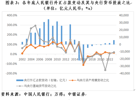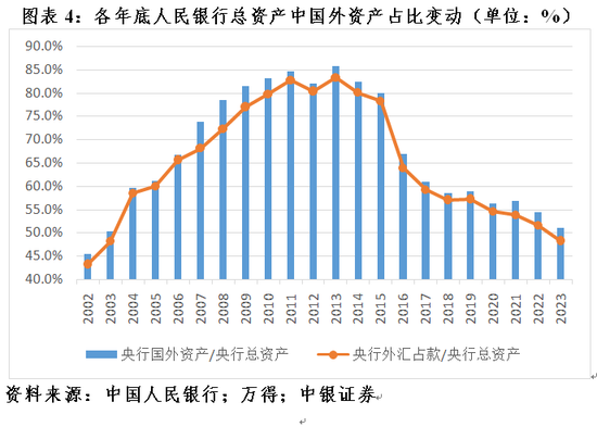 如前所述,由于公开市场操作的交易方式不同,造成了国债“不入表”与“入表”的差异,从而影响了中美两国央行的资产负债表结构。之所以人民银行没有选择对现券交易作为公开市场操作的主要手段,与1994年汇率并轨以来相当长一段时期外汇占款是央行扩表和基础货币投放的主要渠道有关(见图表3)。2008年底至2015年底,央行外汇占款平均占到央行总资产的79.2%,其中2013年底最高占比83.3%。2014年以来,随着国内外汇形势变化甚至阶段性逆转,外汇占款不再是央行货币投放的主渠道后,人民银行又通过一系列货币政策工具创新来丰富流动性调节。除前述公开市场操作工具创新外,还有一系列结构性工具创新。相比于过去因外汇占款变化被动投放,现在央行货币政策自主性得到改善。到2023年底,央行国外资产占到央行总资产的51.1%,较2013年底高点回落了34.7个百分点(见图表4)。
