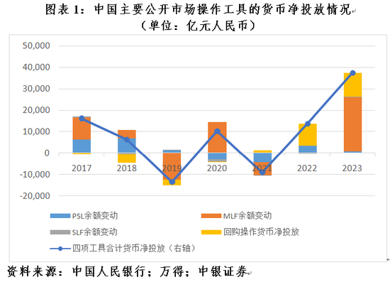 人民银行公开市场业务债券交易主要包括回购交易、现券交易和发行中央银行票据(目前已停止在岸发行)。其中,回购交易分为正回购和逆回购。常见的逆回购为人民银行向一级交易商购买债券,并约定在未来特定日期将债券卖给一级交易商的交易行为,逆回购为央行向市场上投放流动性,到期则为央行从市场收回流动性;正回购则是反向操作。现券交易分为现券买断和卖断两种,前者为央行直接从二级市场买入债券,一次性地投放基础货币;后者则是反向操作。根据货币调控需要,近年来人民银行还不断开展公开市场业务工具创新,如常备借贷便利(SLF,2013年初创设)、中期借贷便利(MLF,2014年9月创设)、抵押补充贷款(PSL,2014年4月创设)等。