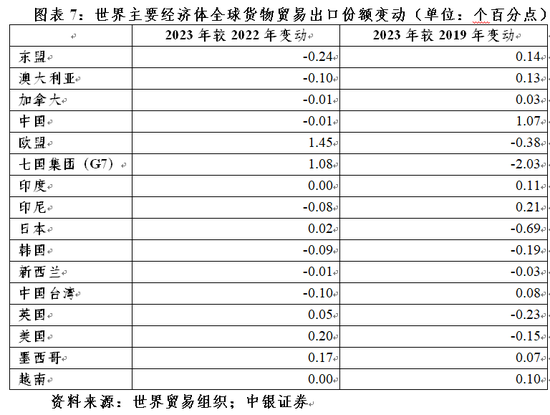 去年,发达经济体出口份额较2022年恢复较多,欧盟上升1.45个百分点,美国、英国和日本分别上升0.20、0.05和0.02个百分点,西方七国集团(G7)合计上升1.08个百分点。但是,较2019年依然分别低了0.38、0.15、0.23、0.69和2.03个百分点(见图表7)。