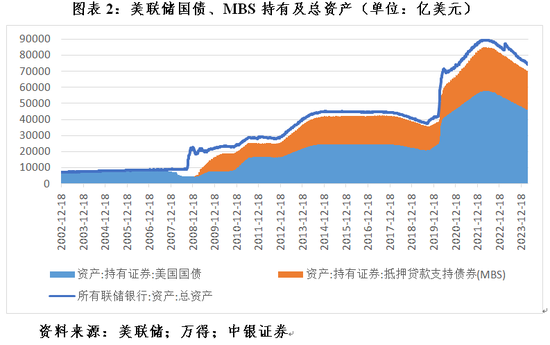 在2008年11月启动第一轮量化宽松之前,美联储资产负债表的资产方“持有证券”中已有“国债”科目,占到当时美联储总资产的80%以上。这意味着当时美联储公开市场操作就是以现券交易为主,国债“入表”了。更不用说在启动QE之后,每月定量购买国债和抵押贷款支持债券(MBS)成了美联储扩表、向市场连续一次性投放流动性的重要手段。到去年底,美联储国债和MBS持有合计占其总资产的93.6%(见图表2)。