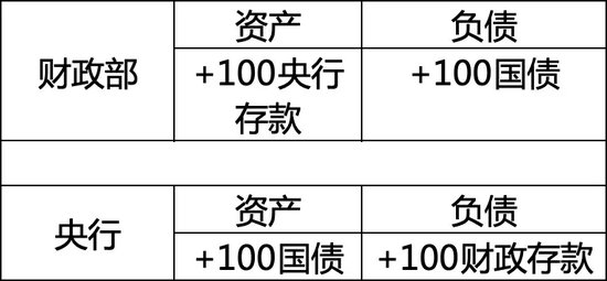 财政部通过商业银行向公众发行国债。财政部在增加100单位资产(现金或/活期存款,下称“央行存款”)的同时,增加100单位的负债(国债)。在国债融资下,央行负债中所增加的央行存款(财政部会首先把获得的资金存入在央行开设的专门账户—国库账户)会被流通中的货币或准备金的减少所冲销。央行的资产负债表不会扩大。