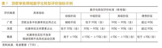 以个人贷款审批为例,主要看以下三个方面。一是应用广度,即机器审批在个人贷款产品审批中的应用占比。一方面要考察有多少产品使用机器审批模式,另一方面也要看机器审批在某个贷款产品审批中所占的比重。例如,某一阶段个人贷款的10%由机器审批、90%由人工审批,而另一阶段个人贷款实现70%由机器审批,仅有30%需要人工审批,则后者数字化水平明显高于前者。二是应用深度,即机器审批支持哪些要素。这一标准主要关注“数据+算法”是否支持被应用于个人贷款利率、期限、额度、还款方式以及风险定价等多个要素,支持的要素越多,意味着数字化水平越高。三是应用精度,即机器审批的不良率是否处于预期范围。机器审批的精度越高,则贷款实际不良率围绕预期不良率的波动范围越小。例如,一个贷款产品运用机器审批的实际不良率与预期不良率之间的差异在30%左右波动,另一个在5%左右波动,表明后者的机器审批精度更高、数字化水平更高。