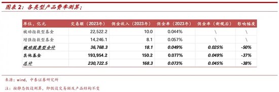 1、公募交易佣金率或将调降至万4.5左右,其中被动股票型佣金率约万2.5,其他型佣金率约万4.9。根据中国基金报,《规定》发布实施后,以静态数据测算,公募基金年度股票交易佣金总额降幅将达38%,2024年、2025年将分别为投资者节省32亿元、64亿元成本,两年将累计为投资者节省近百亿元成本。根据wind数据,2023年公募分仓佣金总额为168.4亿元,平均佣金率为万7.3,根据以上数据推算公募股票交易佣金率将降至万4.5左右(由于新规将于2024年7月1日实施,即2024年执行半年,因此以2025年完整年度进行静态测算之下的结果,静态假设即交易额及产品结构不变);同时,根据被动股票型及其他型产品相关数据,测算得到被动股票型佣金率降至约万2.5,其他型佣金率降至约万4.9。