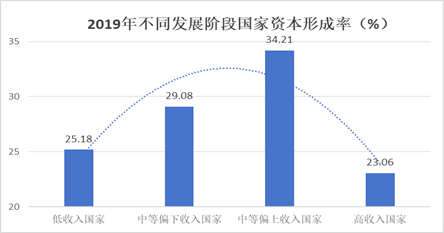 各国经济的经验也表明,投资率变动服从倒U型律。世界银行按照人均国民收入把世界各国划分为四个发展阶段:低收入阶段、中等偏下收入阶段、中等偏上收入阶段、高收入阶段。以疫情前的2019年为例,可以看到:中等偏上收入国家的资本形成率高于中等偏下收入国家及低收入国家,也明显高于高收入国家。