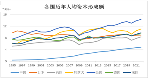 当前,我国仍处于中等收入国家发展阶段。这意味着,较高的投资率和较低的消费率对支撑我国经济发展是十分必要的。事实上,虽然我国资本形成率远远高于发达市场经济国家,但按人均角度考虑,发达国家每年的人均资本形成水平仍远高于我国。根据世界银行数据,与G7等发达国家相比,中国每年的人均资本形成额仍较低,比如,2022年美国人均资本形成额甚至是我国的3倍以上。如此大的差距说明我国在资本积累方面仍有很长的路要走,从人均的角度看,我国的投资不是太多了,反而是少了。
