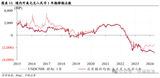 据外汇局统计,今年前三个月,境内掉期交易中“近结远购”交易占比为93.4%,较去年全年上升2.7个百分点(见图表13)。这反映市场主体在强美元背景下持有外币资金的意愿较强,倾向于通过掉期交易满足人民币短期流动性需求。例如,某外贸企业现在收到100万美元的货款收入,近期亟需人民币资金用于经营周转,但企业一年后又需要支付货款约100万美元。假如企业在3月29日办理“近结远购”业务,美元兑人民币即期汇率为7.2232,1年期远掉期点数为-2662个基点,对应的远期汇率为6.9570(见图表14)。这意味着,期初企业将100万美元换成722.32万人民币,而期末企业换回100万美元仅需要向银行支付695.7万人民币。只要人民币未来不升值,企业就不会赔钱。但掉期交易不在即期市场平盘,故近端结汇不直接增加境内外汇供给,而只会增加境内美元流动性。