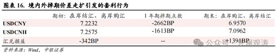 此外,掉期交易占比上升还受到境内外掉期价差走扩引发的套利行为影响。2023年5月份以来,境内外掉期价差明显扩大,2024年3月末价差超1000个基点(见图表15)。这引发了市场主体在境内办理“近结远购”、境外办理“近购远结”的套利行为。虽然在近端损失了境内外汇差,但在远端赚取了更大的境内外掉期价差。同样以3月29日为例,在岸和离岸人民币即期汇率分别为7.2232、7.2575,因此机构在近端办理“在岸结汇、离岸购汇”的汇兑损失为-342BP,但由于1年期境内掉期点数大幅低于境外,在岸和离岸远期汇率分别为6.9570、7.0962,表明机构在远端办理“在岸购汇、离岸结汇”带来的汇兑收益为+1391BP,减去近端的汇兑损失后仍有1049 BP的净收益(见图表16)。