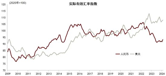 中美两国之间内部需求的差异,对外则体现在汇率的变化上,即人民币实际汇率贬值、美元实际汇率升值。考虑到近期人民币实际有效汇率对一揽子货币并没有贬值,中美两国实际汇率表现的差异不仅是由名义汇率变动导致的,更多反映了两国通胀走势的不同。