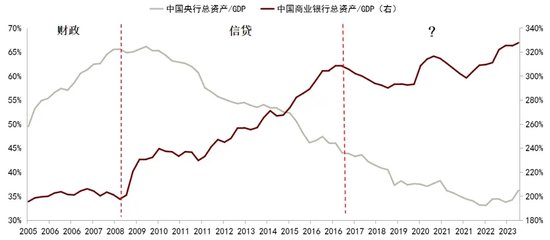21世纪初,中国面临金融周期下行,但整体经济向好,背后的一个重要原因是央行通过购买外汇投放基础货币,这本质上是一种准财政行为,体现为企业与居民部门的银行存款增加。2008年次贷危机后到2017年,中国商业银行资产负债表规模扩张,同期中央银行缩表。2017年以来,商业银行扩表速度明显放缓,而央行继续缩表,整体表现为中国安全资产供给的增速放缓,这也是同期整体金融环境偏紧的根本原因。