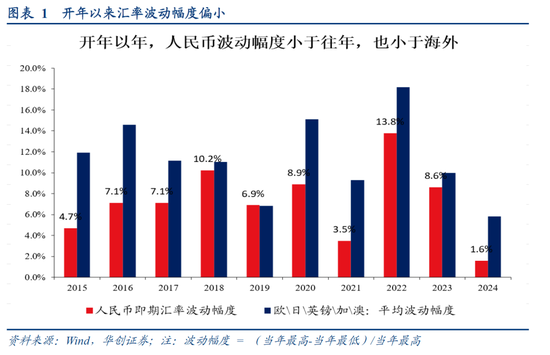 其次,货币政策点名“利率和准备金率”两大工具,但全文并未提及汇率稳定,预计货币政策分两步走,降准先行,降息与汇率弹性后至。结合当下美国物价数据偏强+国内物价数据偏弱的背景,汇率对货币政策的掣肘性客观加大,汇率弹性加大是货币政策利率工具灵活调整的重要前置条件,笔者提示未来或有汇率弹性加大的可能。且开年人民币波动幅度全球偏低(人民币开年以来波动幅度1.6%,欧、日、英镑、加元、澳元等货币波动幅度均值为5.8%),有波动释放的空间。