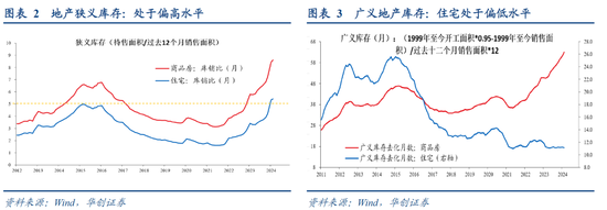 首先,地产库存水平?的确偏高,略好于2015-2016年。我们将地产库存数据与2015-2016年(彼时中央经济工作会议明确提及地产去库存)作比较,发现当下住宅狭义库存较高(已竣工尚未销售),3月,住宅库销比(库存/过去12个月销售均值)达到5.4(月),高于上一轮高点。但,当下广义库存并不高(已开工未完成销售),3月,住宅广义库存去化月数为11.1个月,上一轮高点超过25个月,主要原因是2021年-2024年1季度,住宅新开工面积持续小于住宅销售面积,尽管住宅销售面积在回落,但住宅广义库存绝对量也在回落。