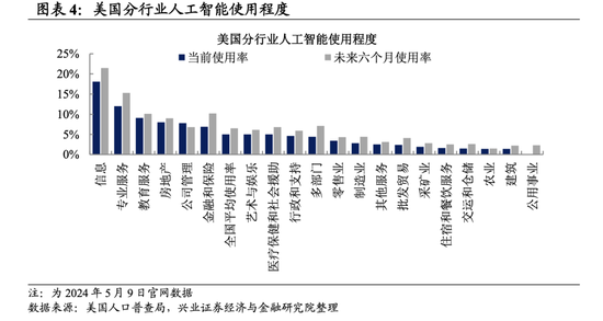 经济结构使得人工智能在美国经济中的应用场景主要局限于服务业。任何新兴行业的发展都需要持续的投入,而新的投入也需要实业来买单。从美国角度来看,2023美国GDP中71.7%为私人服务业,若考虑政府部门,则超过80%为非一、二产业。而二产中,制造业增加值占GDP的比重仅为10.3%。在服务业内部,公用事业、信息业、金融和专业服务的平均小时工资较高。从服务业的规模和用工成本两个角度来看,就不难理解为何AI在美国的部分服务业中普及率更高。但相对来说,由于工业占比较低,因此美国就较为缺乏人工智能在工业制造方面的应用场景。此外,由于美国服务业吸纳非农就业人数约86%,人工智能的应用不可避免地将对这部分就业人群产生冲击,进而可能会导致潜在的社会问题。