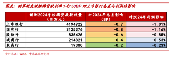 ②对银行息差影响总体有限:对于商业贷款利率部分,取决于银行成本与居民购房需求的博弈。根据上市银行数据,2023年上市银行平均计息负债成本为2.26%,2023年平均信用成本为0.75%,根据按揭贷款不良率和银行总体不良率的对比情况,假设按揭贷款信用成本为平均信用成本的三分之一,即0.25%,结合上市银行2023年费用情况,则按揭贷款的利率定价下限=负债成本+信用成本+费用成本=2.26%+0.25%+0.67%=3.2%。假设2024年加回提前还贷后按揭投放量与2023年相当(提前还贷量按照RMBS条件早偿指数估计,加回后投放量为负的调整为0),新发放按揭贷款利率下调50BP对上市银行全年息差的冲击为0.7BP,对利润的冲击约为1%(实际影响会更小,此前已有政策对新建商品住宅销售价格环比和同比连续3个月均下降的城市,阶段性放宽首套住房商业性个人住房贷款利率下限,很多城市已因城施策有所调整)。