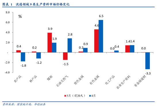 预计5月份CPI同比从0.3%回升至0.4%。预计5月份PPI同比从-2.5%回升至-1.4%左右。对于PPI,除基数影响外,我们更关心环比变化。5月,PMI出厂价格指数升至50.4%,时隔8个月再回扩张区间。根据统计局对全国流通领域9大类50种重要生产资料市场价格的监测数据,5月(前20天)上涨较多的包括有色金属类(4.9%)、煤炭类(3.9%)。此外,非金属建材类环比持平,好于4月表现(环比下跌3.3%)。