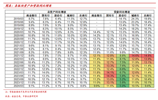 分板块看:1、国有行资产同比增速环比下降2个百分点至11.2%,信贷同比增速环比下降1.5个百分点至11.6%;单季新增信贷5.07万亿,同比少增7179亿。2、股份行资产同比增速下降2.5个百分点至4.1%,信贷同比增速环比下降0.8个百分点至5.0%;单季新增信贷1.13万亿,同比少增2541亿。3、城商行资产同比增速环比下降1个百分点至9.7%,信贷同比增速环比下降0.5个百分点至10.5%;单季新增信贷1.28万亿,同比基本持平。4、农商行资产同比增速环比下降1.3个百分点至8.8%,信贷同比增速环比下降0.7个百分点至9.4%;单季新增信贷1.28万亿,略低于2023年同期。(本文信贷数据由不良余额和不良率测算,增速与央行金融数据有误差。)
