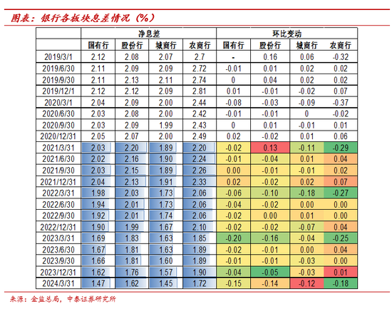 分版块来看,净息差最高的农商行板块降幅最大。国有行、股份行、城商行、农商行1Q24息差分别边际变动-15bp、-14bp、-12bp、-18bp至1.47%、1.62%、1.45%和1.72%。