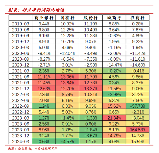 净利润:1Q24商业银行净利润同比增0.66%(2023同比增3.24%)。分板块看,国有行、股份行、城商行、农商行净利润同比增速分别为-4.57%、+1.17%、+4.08%、+15.59%。国有行主要是拨备释放贡献减弱。根据我们在《深度综述与拆分 | 42家上市银行年报及一季报:规模、其他非息正贡献,息差和手续费承压》的分析,上市银行1Q24营收同比-1.9%,净利润同比-0.6%,业绩高增标的仍是中小银行居多;规模与其他非息是主驱动,拨备对利润释放贡献边际减弱、行业留存余粮。