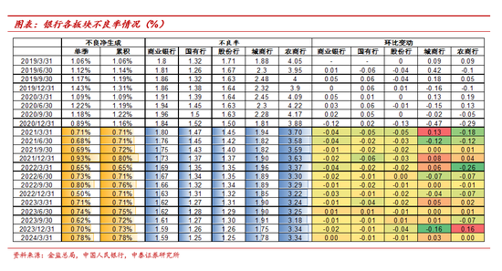 不良率维持稳定。具体来看:1、行业整体不良贷款余额较4Q23末有所上升,不良率环比维持稳定。1Q24末全银行业贷款总额规模为211.58万亿,环比4Q23增长9.05万亿。1Q24末全银行业不良贷款规模为3.37万亿,环比4Q23末增长1414亿元,主要源于贷款规模增长产生的不良自然增长。不良率1.59%,环比保持不变。2、城商行不良率环比上升,农商行维持稳定,大行、股份行小幅下降。国有行、股份行、城商行、农商行1Q24末不良率分别为1.25%、1.25%、1.78%、3.34%,环比变动-1bp、-1bp、+3bp、0bp。