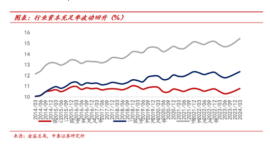 1Q24或受资本新规影响,资本充足率明显上升。1Q24末商业银行(不含外国银行分行)核心一级资本充足率、一级资本充足率、资本充足率分别为10.77%、12.35%、15.43%,较2023末分别环比+23bp、+23bp、+37bp。