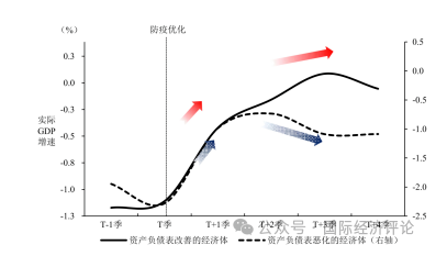 注:实际GDP为复合增速较疫情前均值的差值;资产负债表改善的经济体包括美国、德国、加拿大、澳大利亚、新加坡,受损的经济体包括日本、韩国、泰国、印度尼西亚、中国台湾。各经济体防疫优化的时间T分别为:美国2021年一季度,新加坡2021年二季度,其余经济体为2021年三季度。