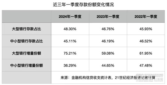 根据‘21世纪经济报道’的统计,仅以一季度存款变化来看,大型银行的存款增速和增量份额均显著高于中小银行,而对比过往的数据来看,两者的差距正在不断扩大。