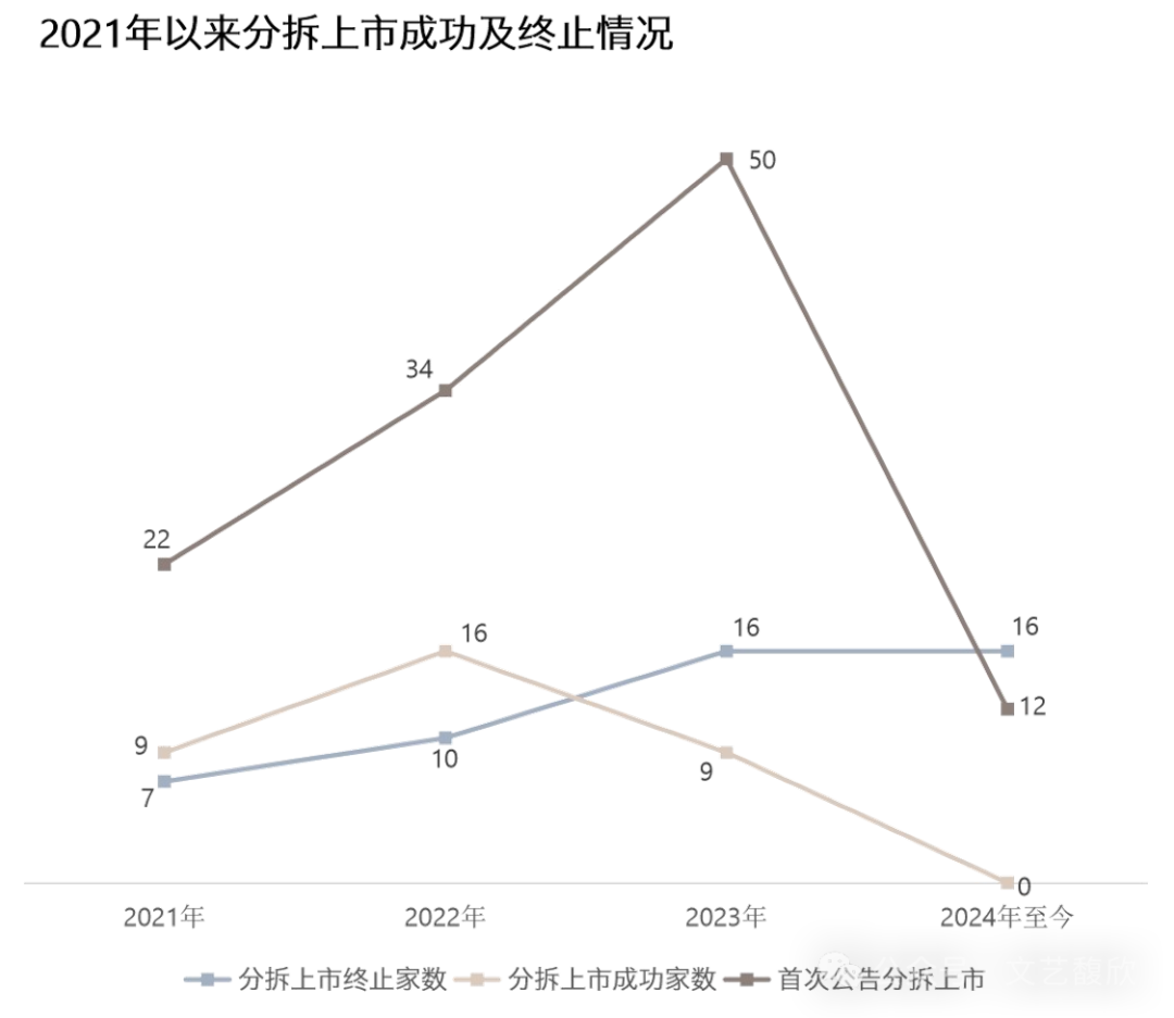 今年以来,因上述政策、企业自身经营情况等因素影响,分拆上市呈现了终止数量增多、成功上市及拟分拆上市公司数量均显著减少的情形。