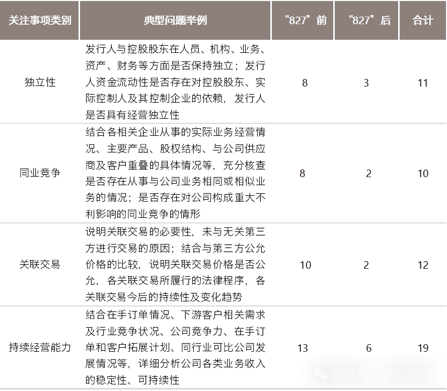 今年终止的16家分拆上市案例审核过程中共披露了21份问询回复。以《证监会统筹一二级市场平衡优化IPO、再融资监管安排》(以下简称“827新政”)作为时间节点,15份问询回复于“827新政”前披露,6份问询回复于“827新政”后披露。新政前后,分拆上市中重点关注的关联交易、同业竞争、业务持续经营能力、经营独立性等问题依旧为审核重点关注对象,此类问询关注事项总结如下: